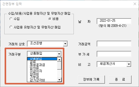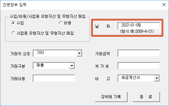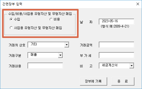 "간편장부 입력" 버튼을 클릭하시면 간편장부를 입력할 수 있는 팝업창이 생성됩니다.