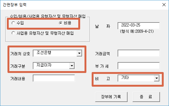 간편장부를 입력하고 "장부에 기록"을 클릭하면 아래와 같이 수입/비용/~, 거래처, 거래구분, 비고가 이전에 입력된 상태로 남아 있습니다.