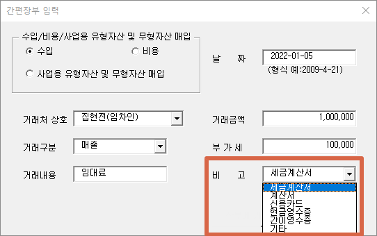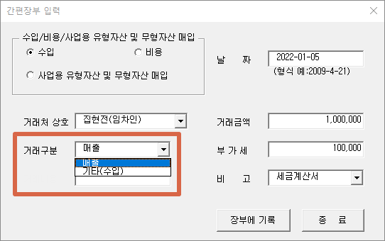 거래구분은 "4-1. 수입/비용/ ~" 항목에서 수입으로 입력했는지 비용으로 선택했는지에 따라 다르게 나오는데요.
