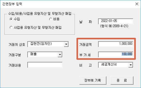거래금액은 부가세를 제외한 금액을 입력하시면 되고, 거래금액을 입력하면 부가세가 자동으로 입력됩니다.