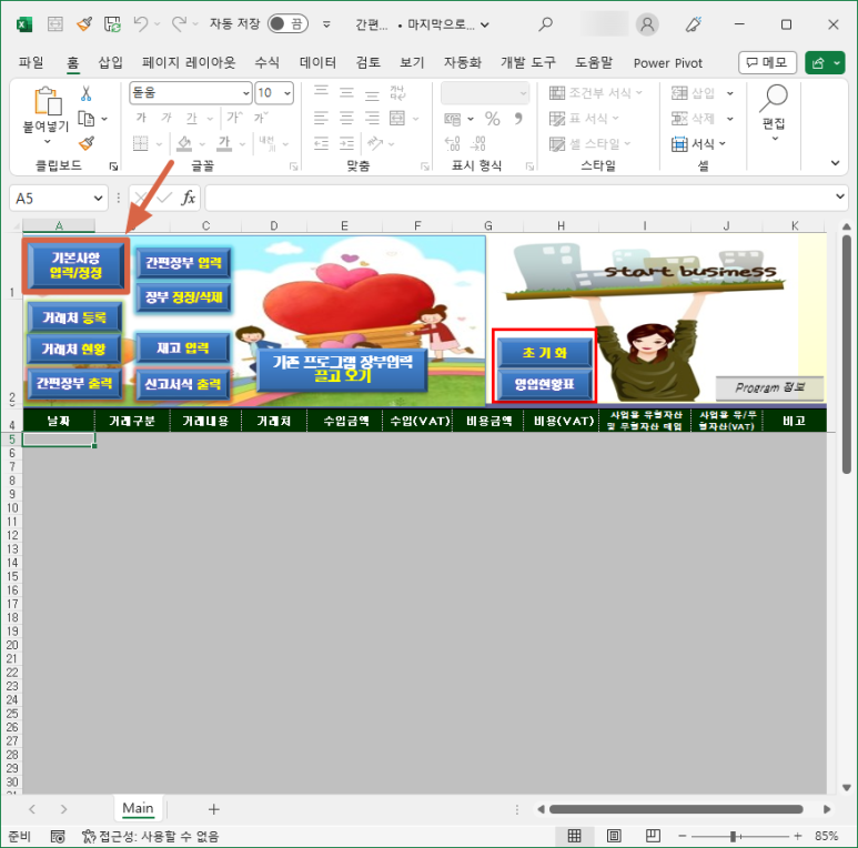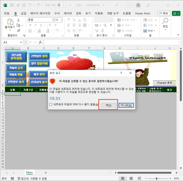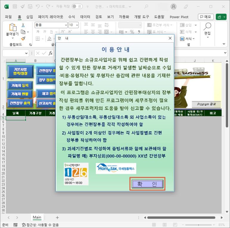 다운로드한 간편장부 프로그램을 열면, 뭐가 안됩니다.
