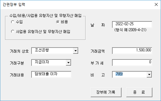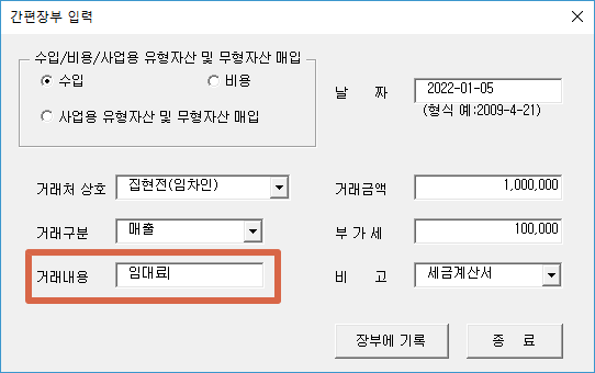 이렇게 하면 한 건의 간편장부 입력이 끝납니다.