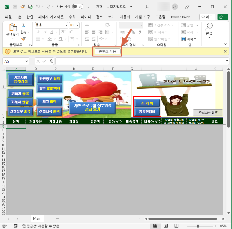 이때, 리본메뉴 밑에 있는 "콘텐츠 사용"을 누르시면 데이터를 입력할 수 있습니다.