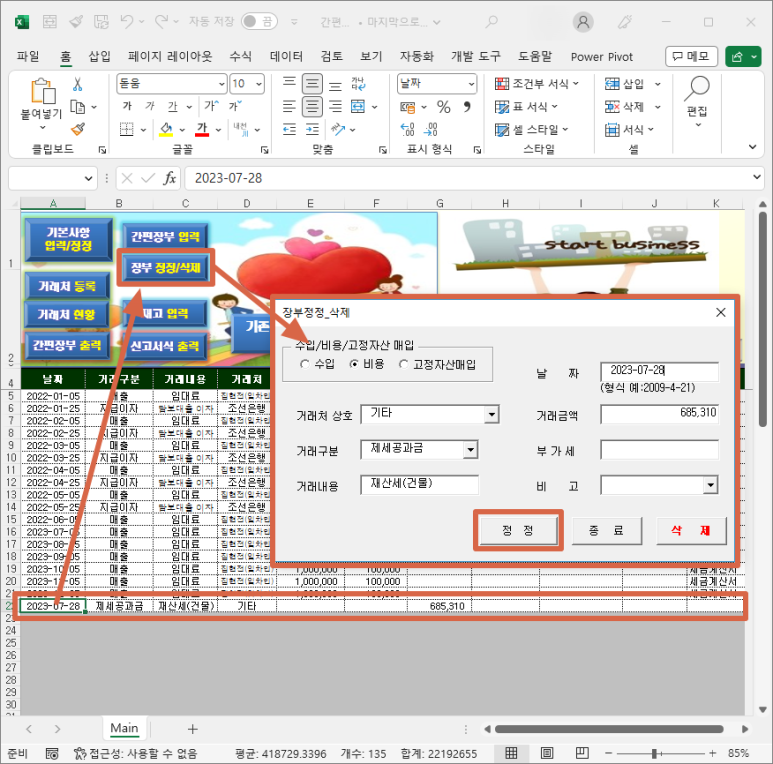 2) "장부 정정/삭제" 버튼을 클릭하신 다음