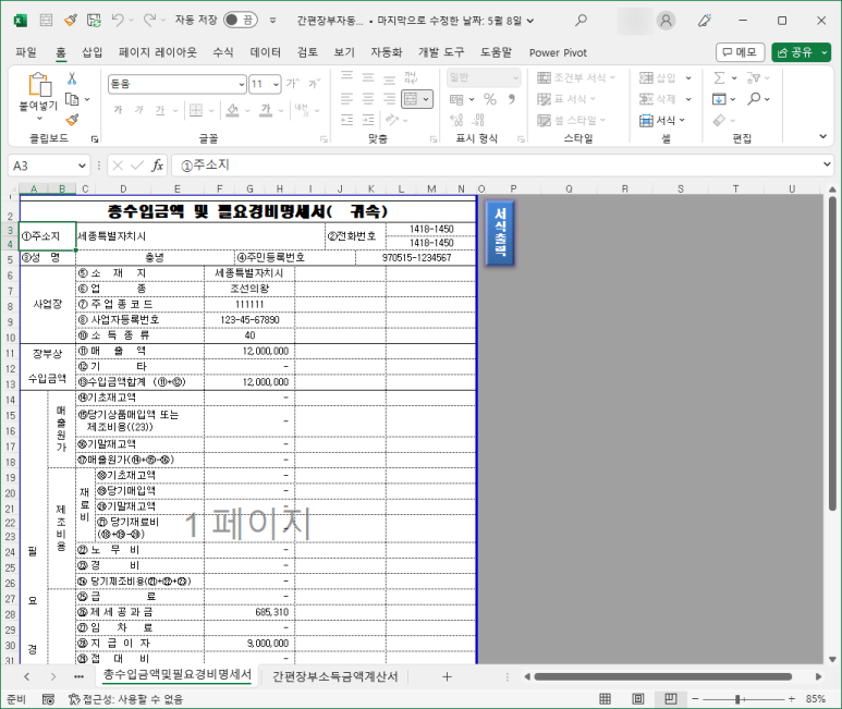 "신고서식 출력" 버튼을 클릭하면 홈택스에 신고할 때 입력하는 서식대로 화면에 표시됩니다.