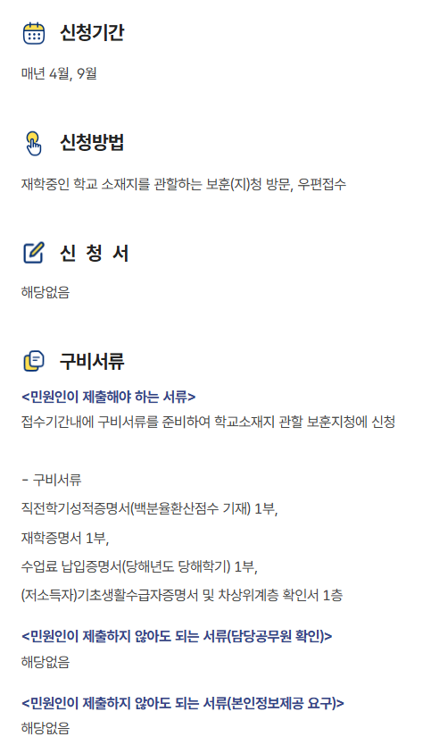 - ✅ 2학기 신청은 보통 9월, 1학기 신청은 4월에 관할 보훈(지)청에 방문/우편으로 접수해야 합니다.