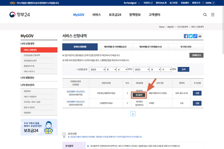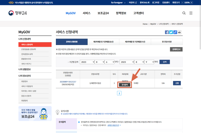 신청내역에서 민원신청한 문서에서 "문서출력"을 클릭해서 나오는 팝업창에서 문서를 출력하면 됩니다.