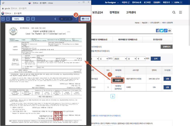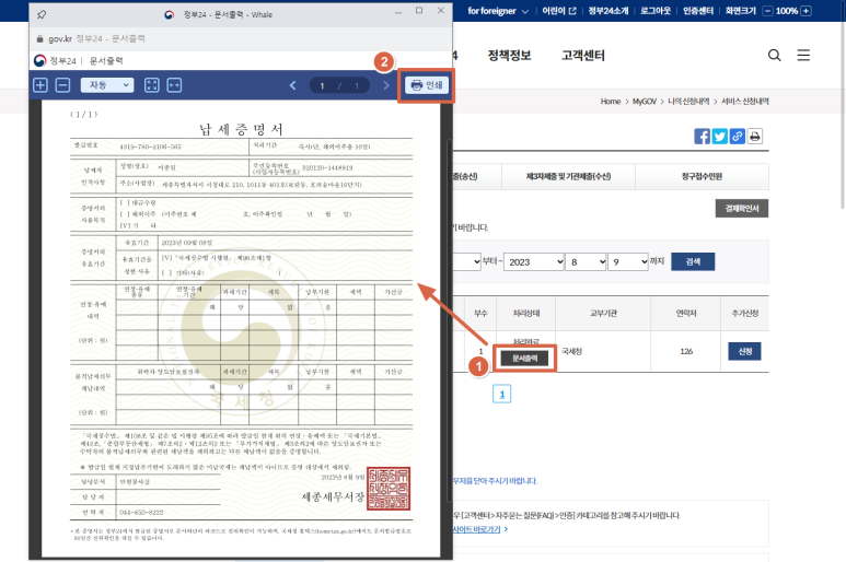 신청한 문서를 출력하는 방법은 국세완납증명서와 동일합니다.