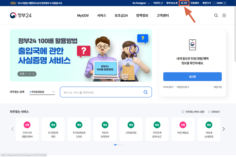정부24 사이트에 접속해서 화면 상단에 있는 "로그인" 버튼을 클릭합니다.