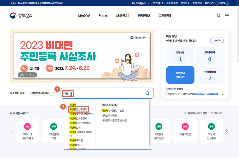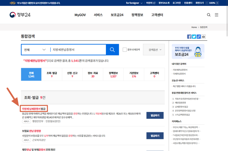 검색창에 "지방세"라고 입력한 후 검색창 밑에 보이는 "지방세완납증명서"를 클릭하시면 됩니다.