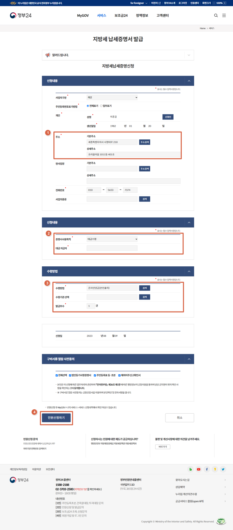 3-3. 주소, 신청내용, 수령방법 입력 및 민원신청