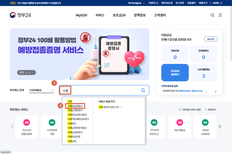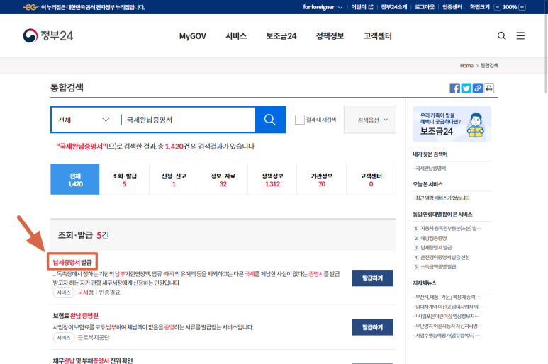 정부24 메인화면 중간쯤에 있는 검색창에 "국세"라고 입력하면 연관검색어가 쭉 뜨는데 그중에 "국세완납증명서"를 클릭하시면 됩니다.