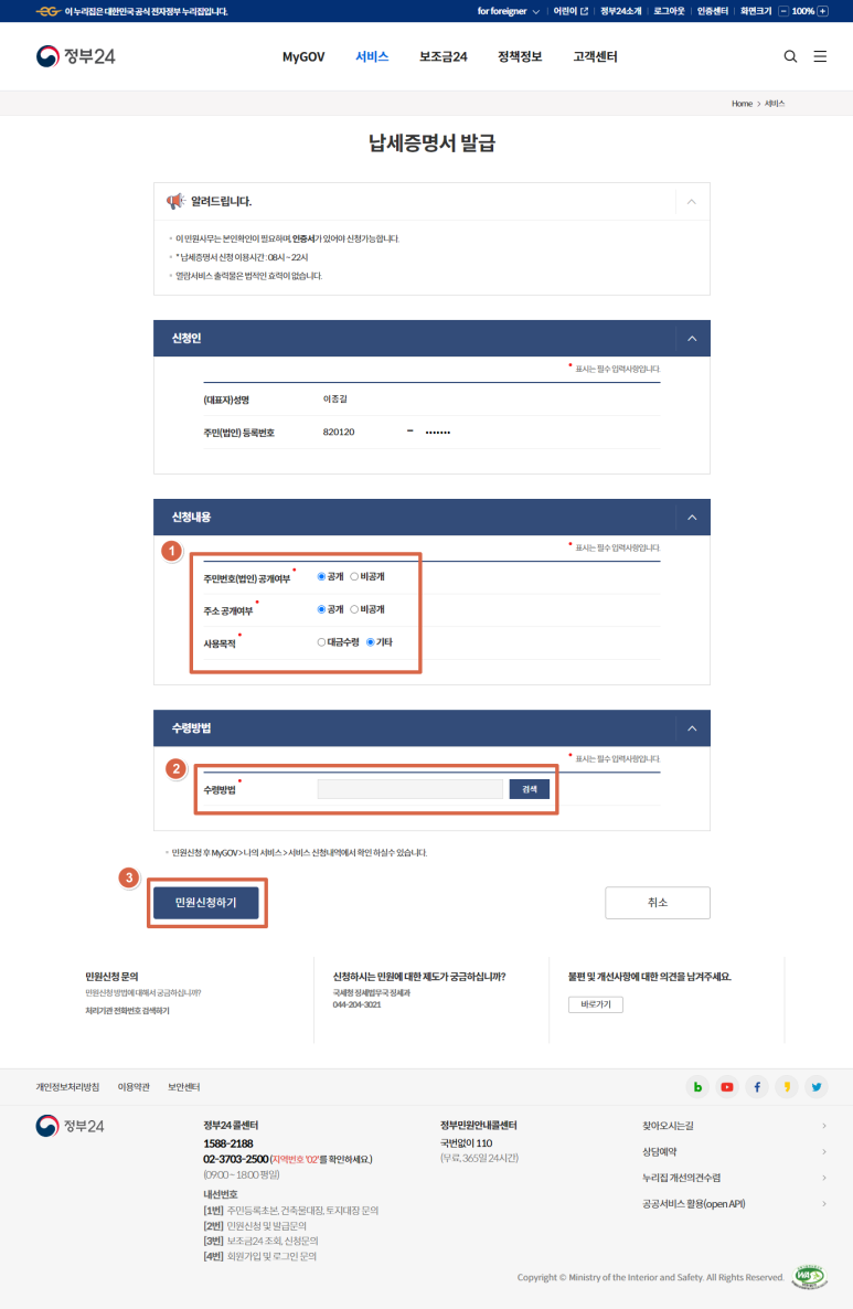 납세증명서에 주민등록번호와 주소를 공개할지 여부와 사용목적을 선택하신 후 수령방법을 선택하신 후 맨 밑에 있는 "민원신청하기" 버튼을 클릭하시면 납세증명서를 발급받으실 수 있습니다.