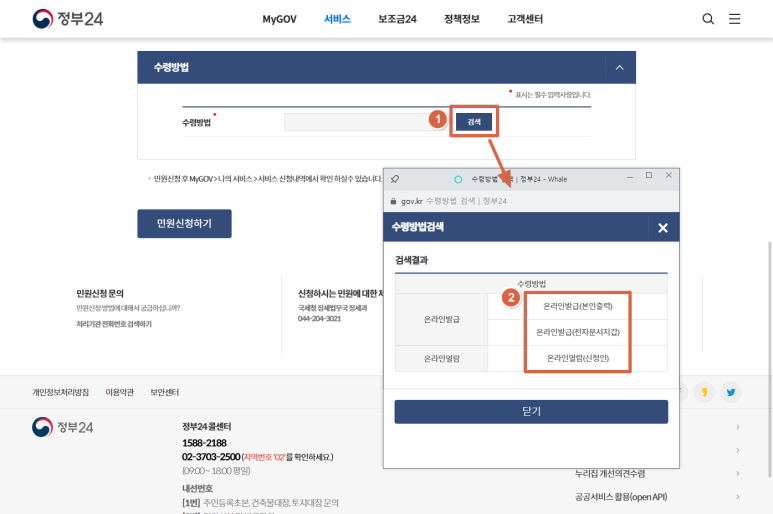 2-3. 신청내용, 수령방법 선택 및 민원신청