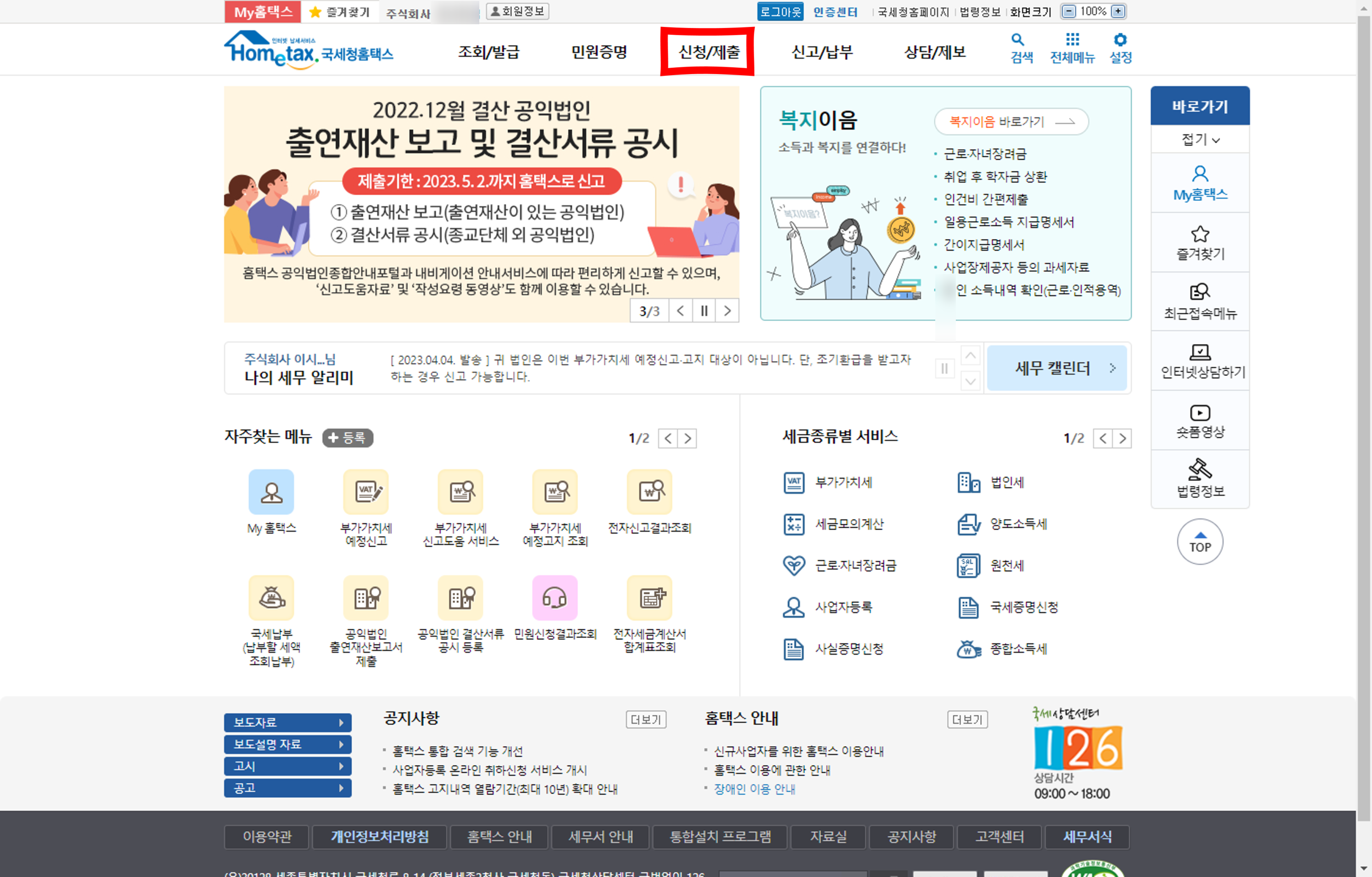 홈택스 메인화면 상단에 있는 "신청/제출" 메뉴에 들어가시면 됩니다.