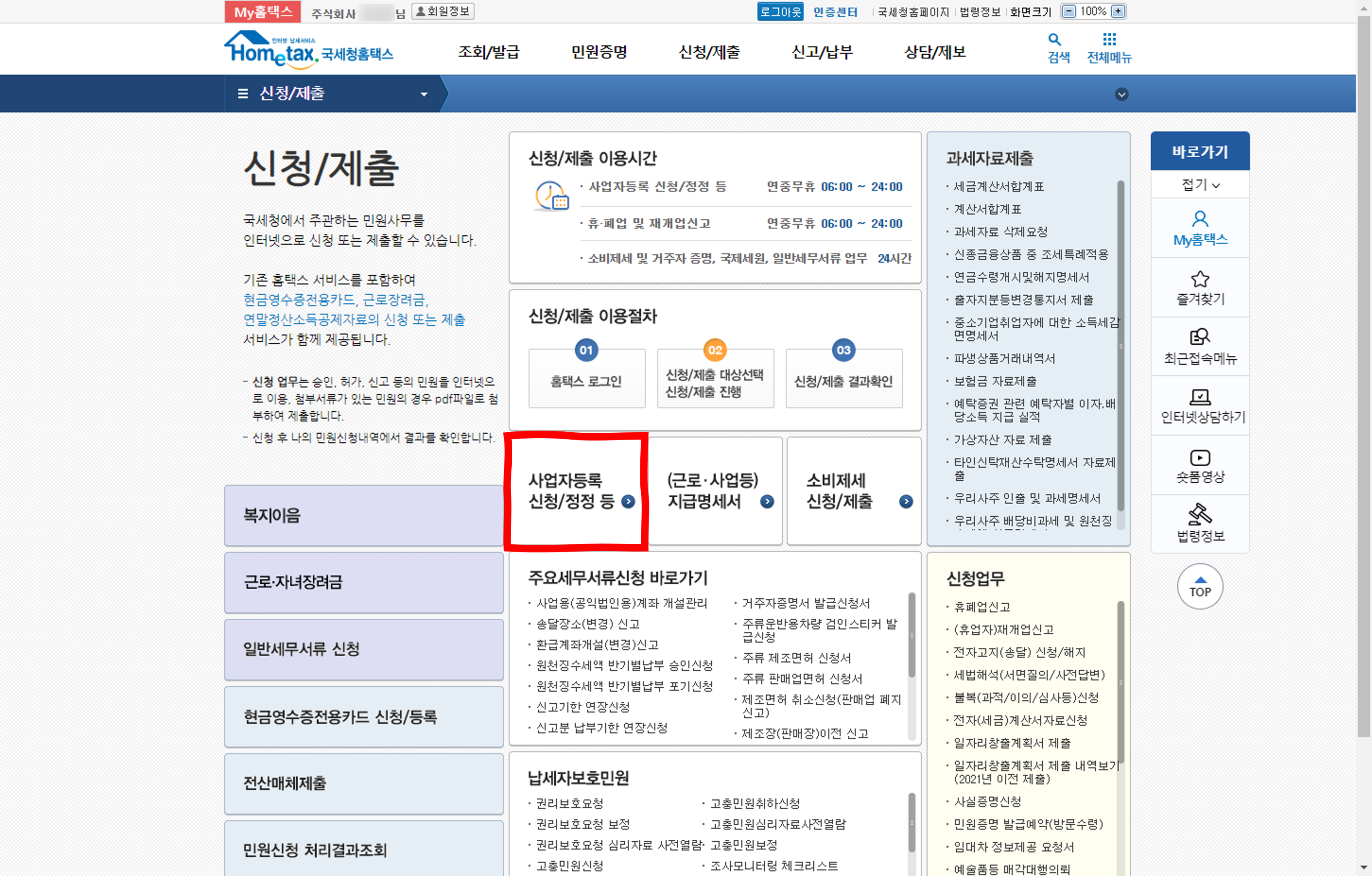 신청/제출 메뉴화면 중간쯤에 있는 "사업자등록 신청/정정 등" 메뉴를 클릭합니다.
