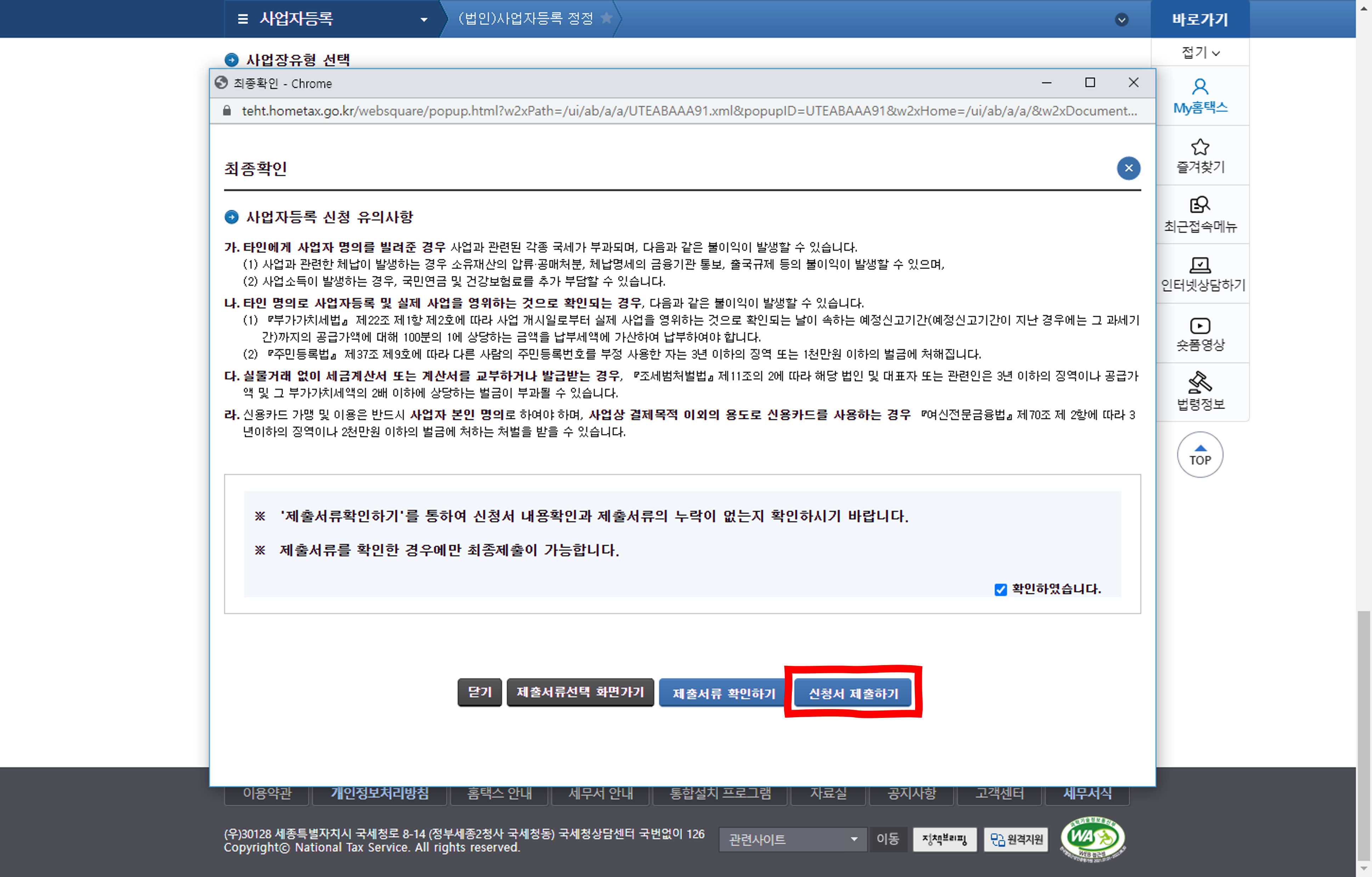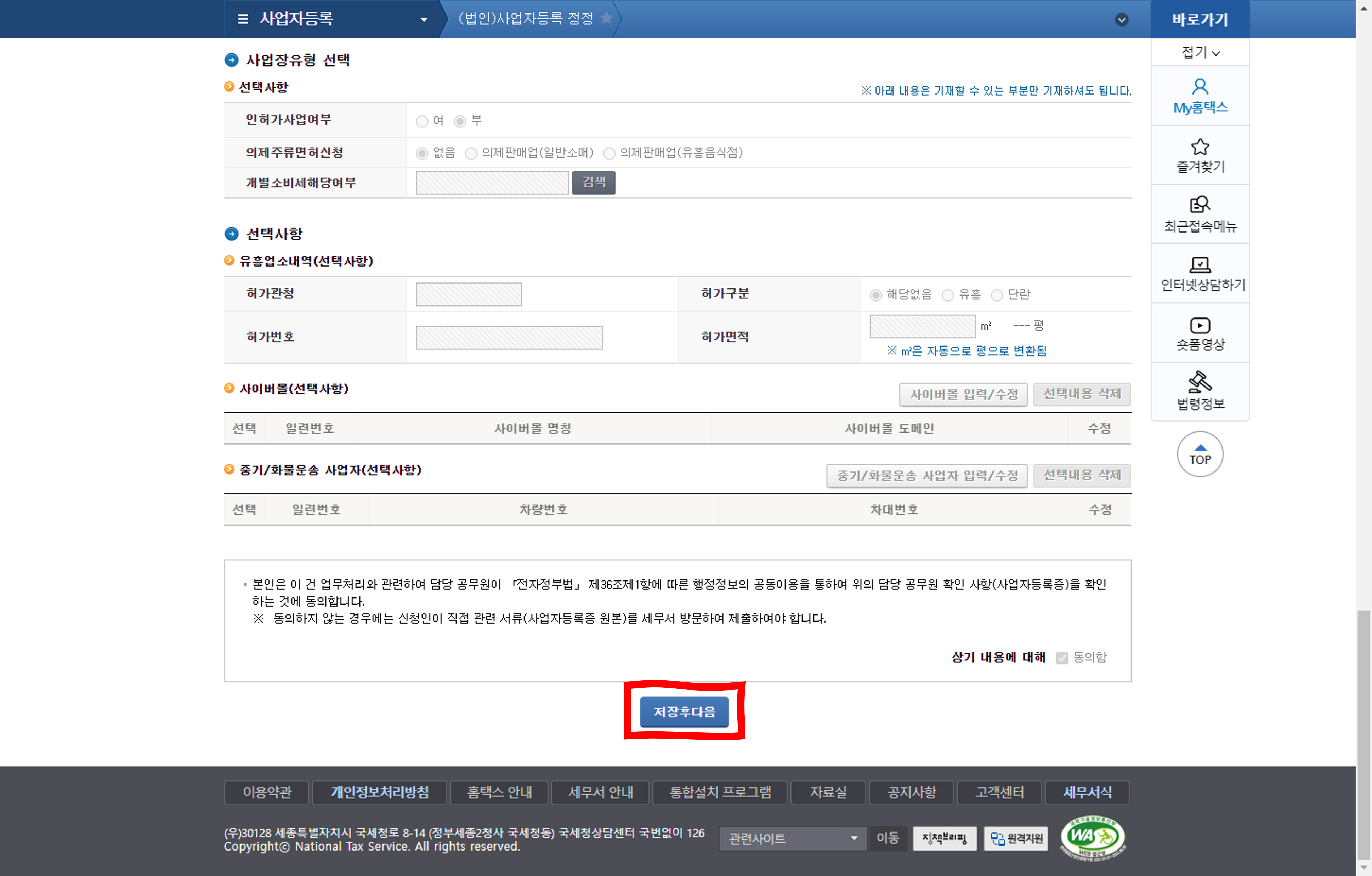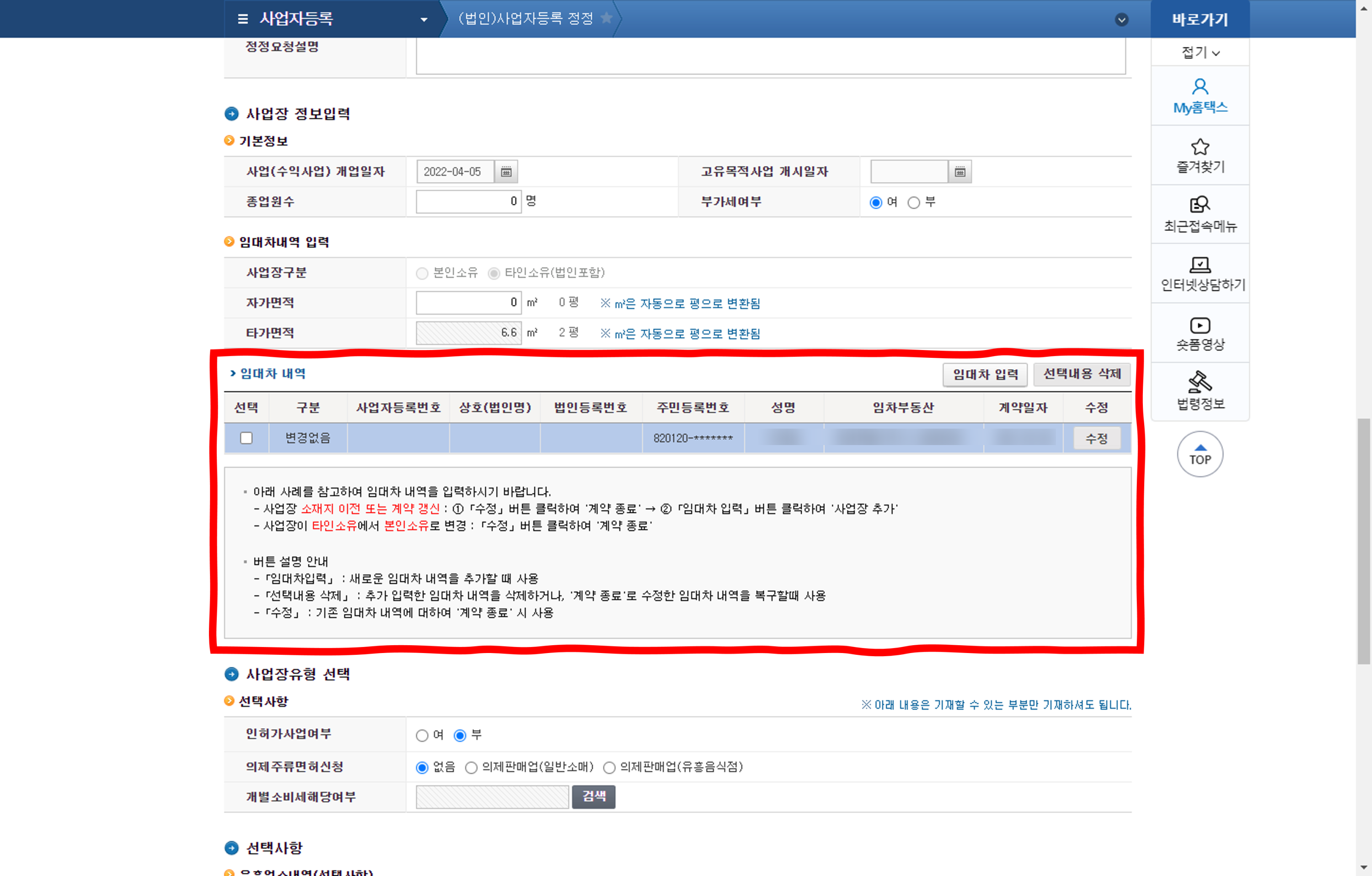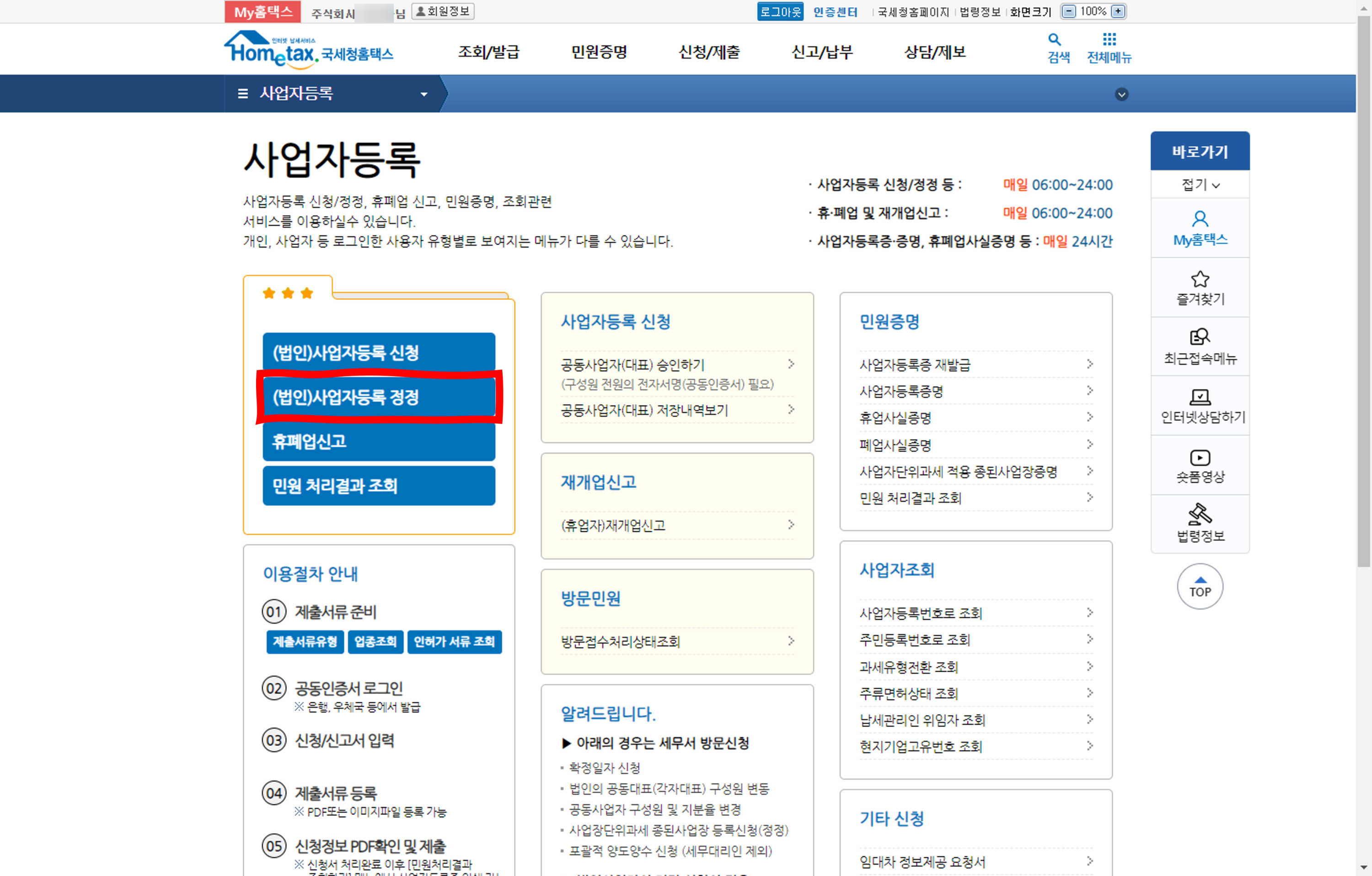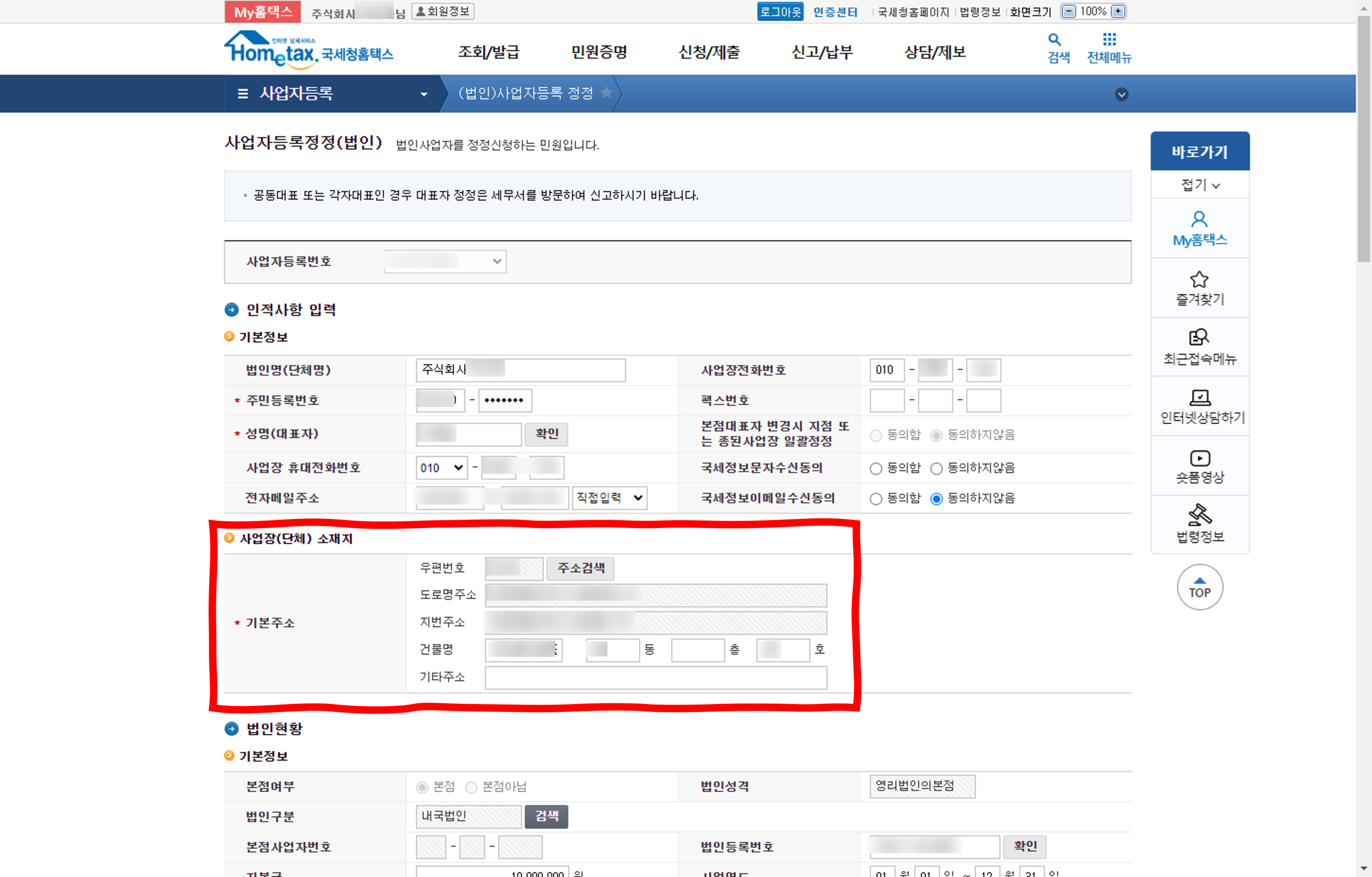 오른쪽에 파랑색 메뉴에 있는 "(법인)사업자등록 정정" 메뉴을 클릭합니다.