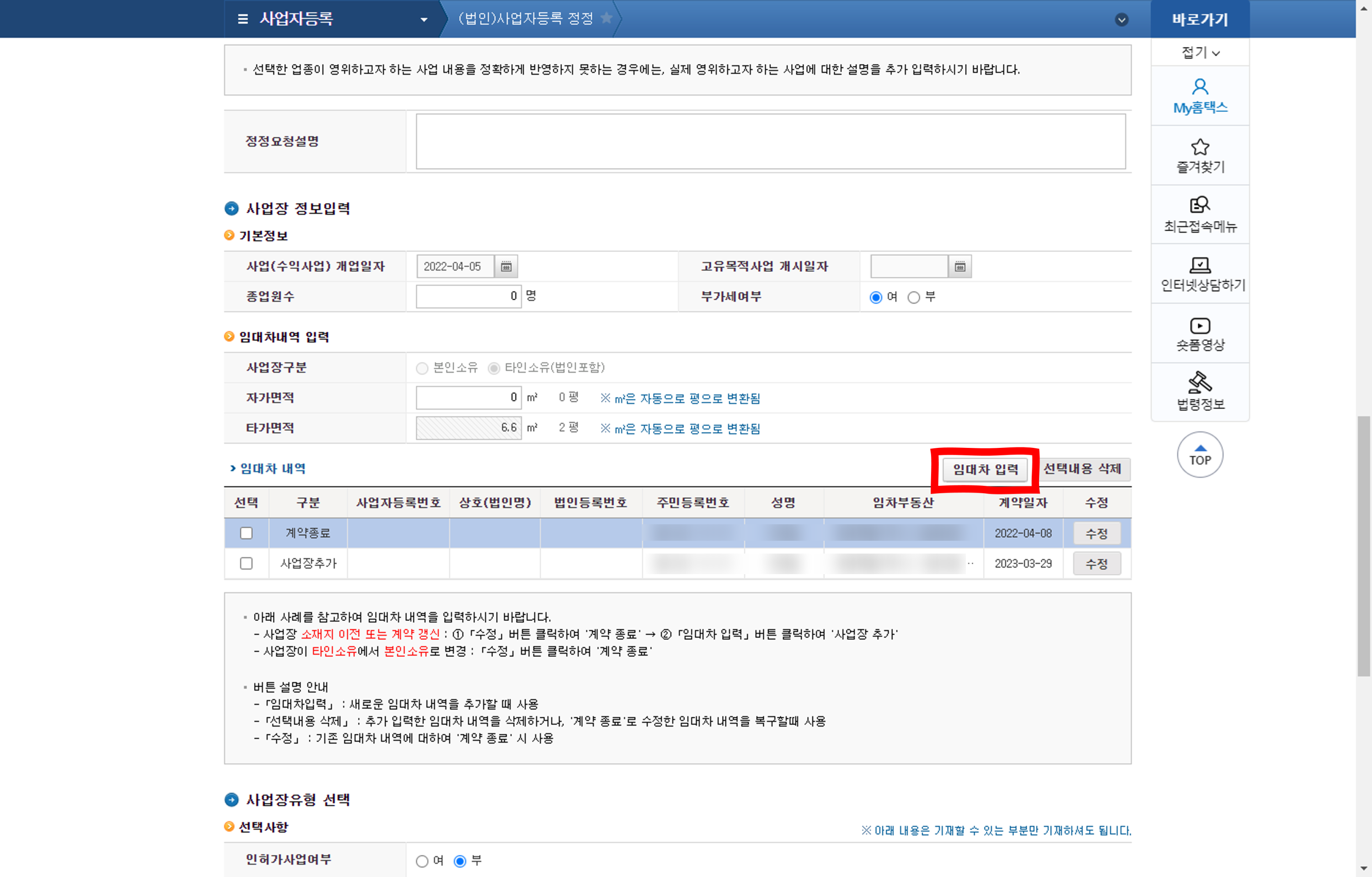 계약 종료를 선택하시고, 계약 종료일자를 입력하신 후에 "등록하기" 버튼을 클릭하시면 됩니다. 여기서 계약종료일자는 법인등기부등본에 있는 변경일자를 넣으면 되겠죠? 이전 임대차계약이 종료되었으니 새로운 임대차 계약정보를 등록합니다. 아까 그 목록에서 "임대차 입력" 버튼을 클릭합니다.