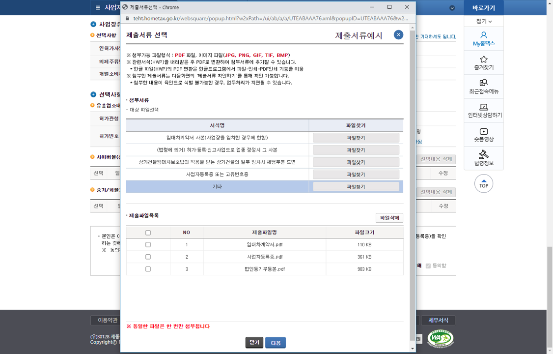 제출서류는 필요한 것만 선택해서 등록하면 되는데요, 저는 임대차계약서, 사업자등록증, 법인등기부등본을 등록했어요.