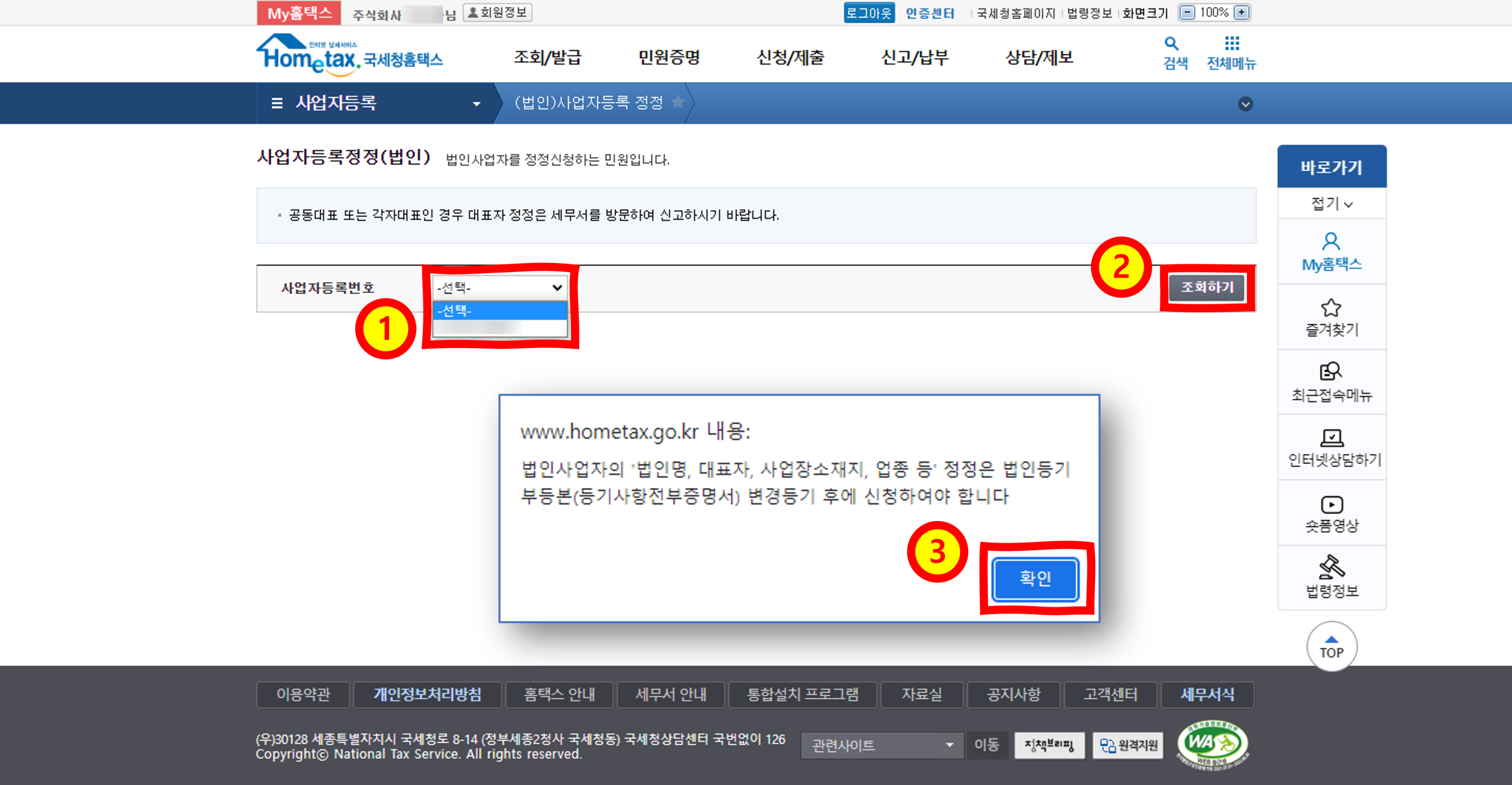 ① 여기서 변경하고자 하는 사업자등록번호를 선택하신 후에
