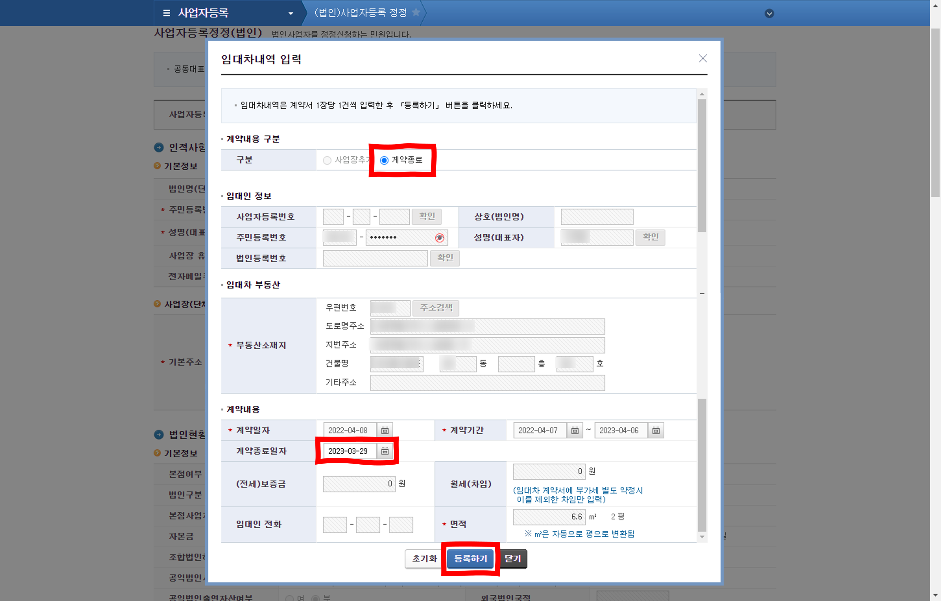 아래와 같이 임대차 내역을 입력할 수 있는 팝업창이 생성되는데요, 여기에 이전한 주소와 계약정보를 입력하면 됩니다.