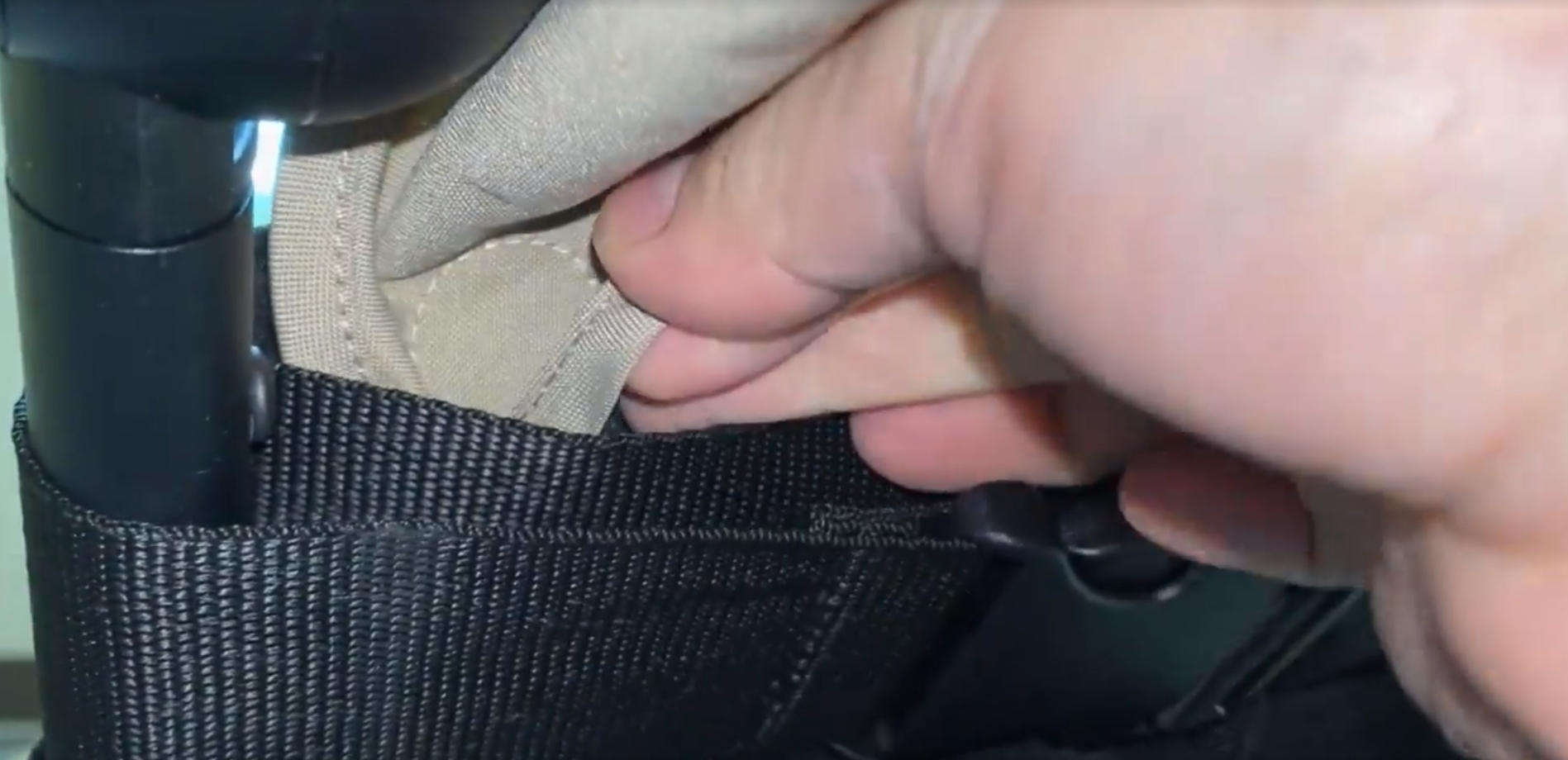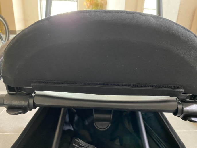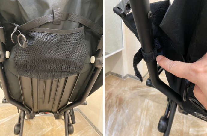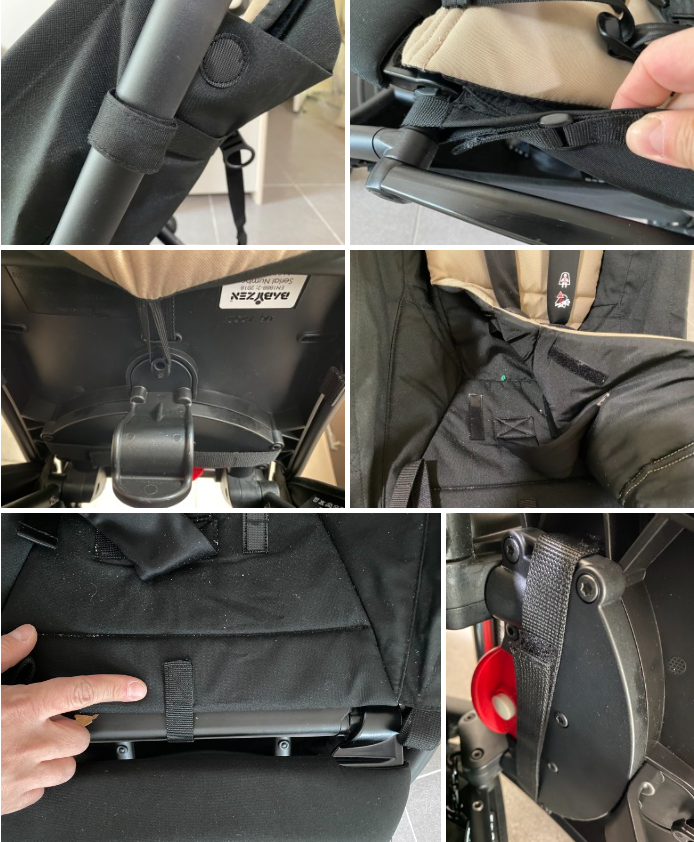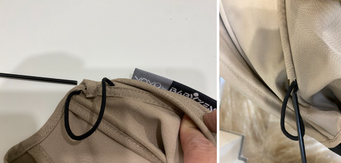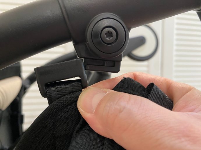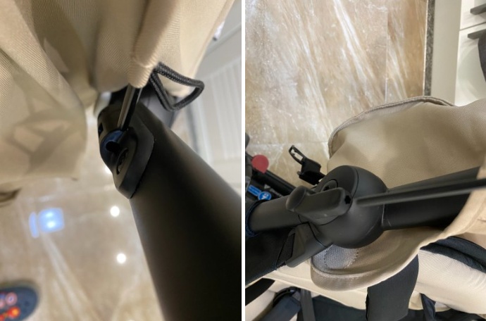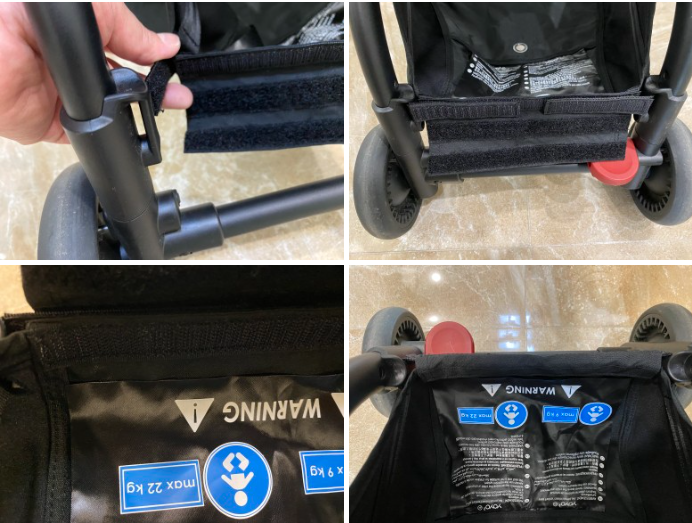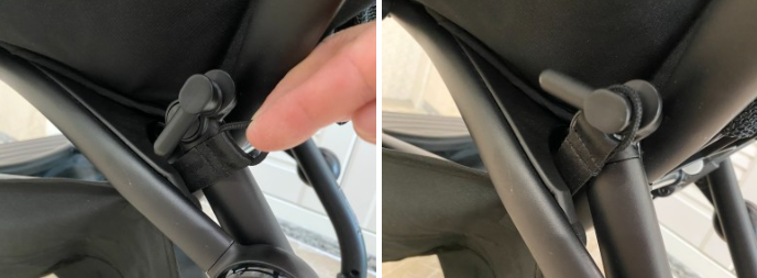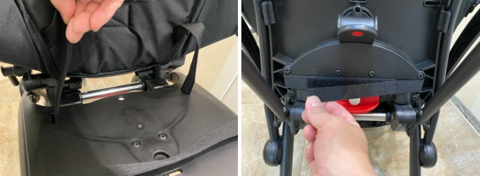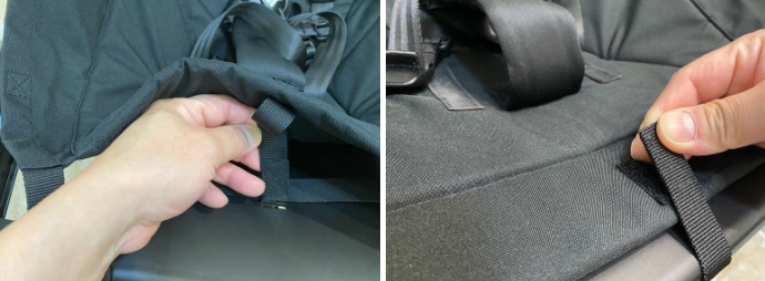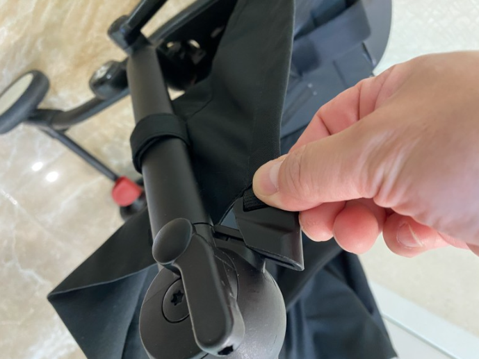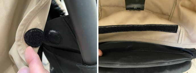 바닥 부분에 구멍이 두 개 나 있는데, 찍찍이를 통과시킨 후 유모차를 뒤집고 찍찍이를 연결시켜서 붙이면 됩니다.