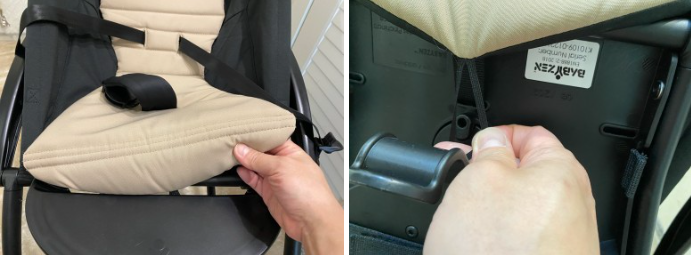 어깨 쪽과 허리 쪽, 가랑이 쪽 안전벨트를 먼저 폭신폭신한 시트 구멍에 넣으신 후에 찍찍이를 붙이시면 됩니다^^