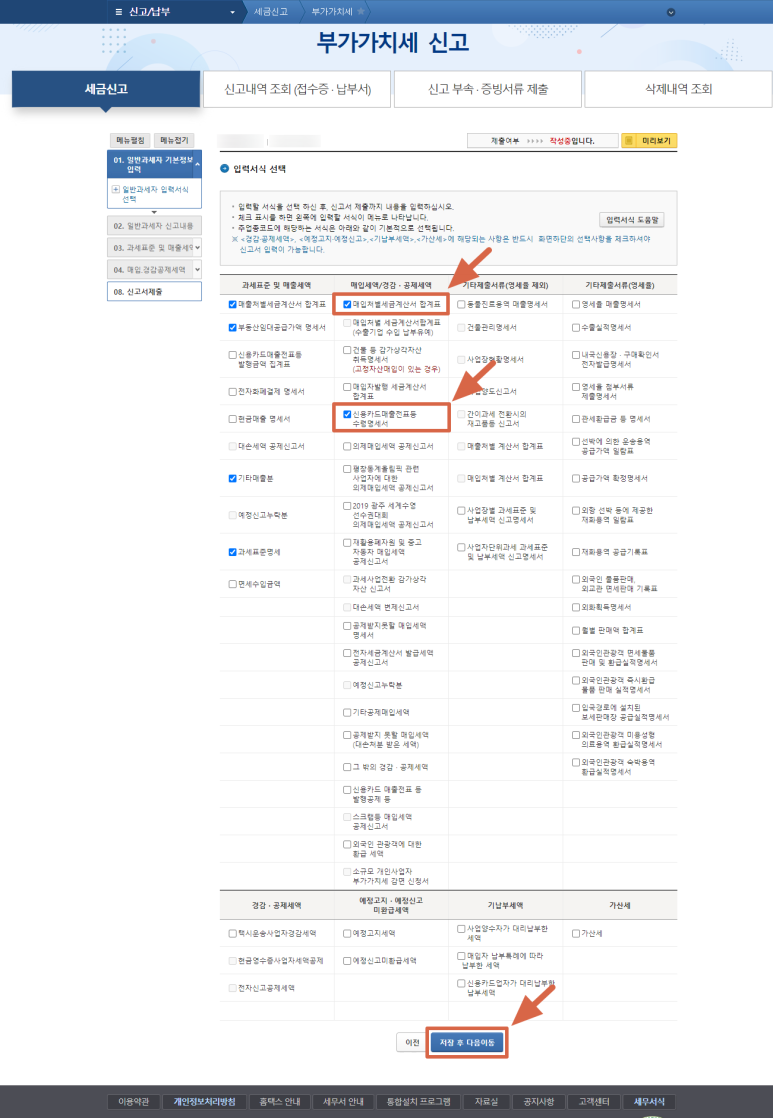 매출, 매입 등 어떤 항목을 신고할 것인지를 선택하는 단계입니다. 건물분 부가세환급을 위해 "매입처별세금계산서 합계표" 항목과 "건물 등 감가상각자산 취득명세서" 항목을 선택해야 합니다.