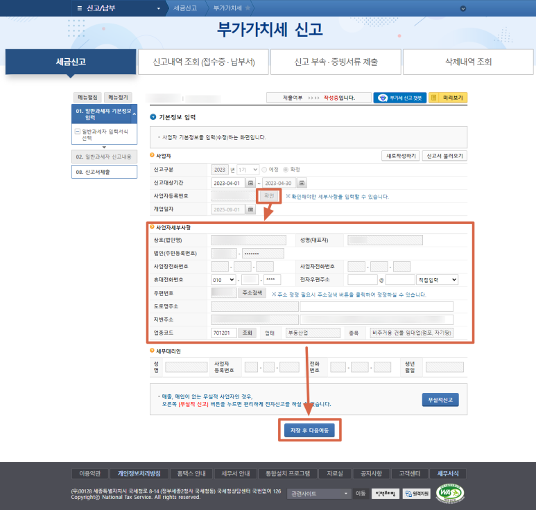 2) 사업자세부사항 내용을 확인하시고, 이상이 없으시면 "저장 후 다음이동"을 클릭합니다.