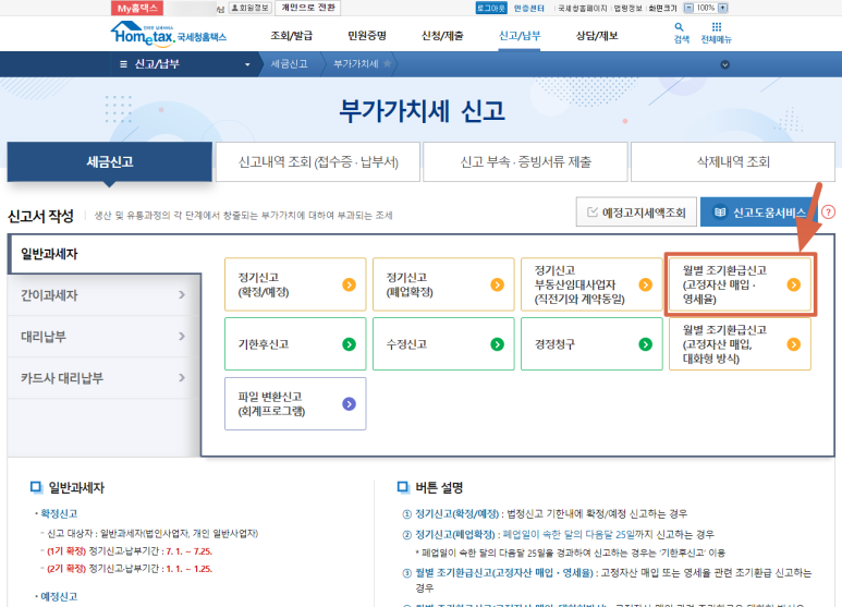 지금은 부가세 신고기간이 아니기 때문에 메인화면에서 접근하는 것보다 상단 메뉴에서 접근하는 것이 찾기가 쉽습니다. 1. "신고/납부" → "부가가치세"를 선택(클릭) 합니다. 2. "월별 조기환급신고(고정자산 매입·영세율)" 항목을 클릭합니다.