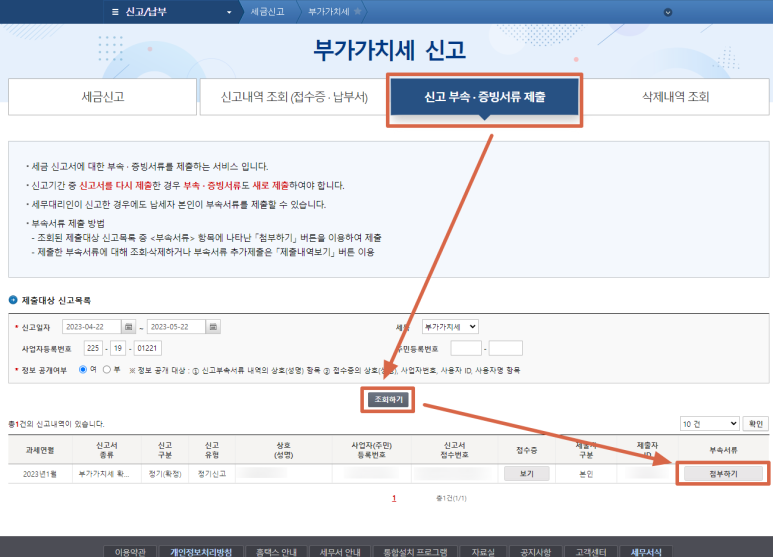 3) 신고목록의 부속서류 항목에서 "첨부하기"를 클릭합니다.
