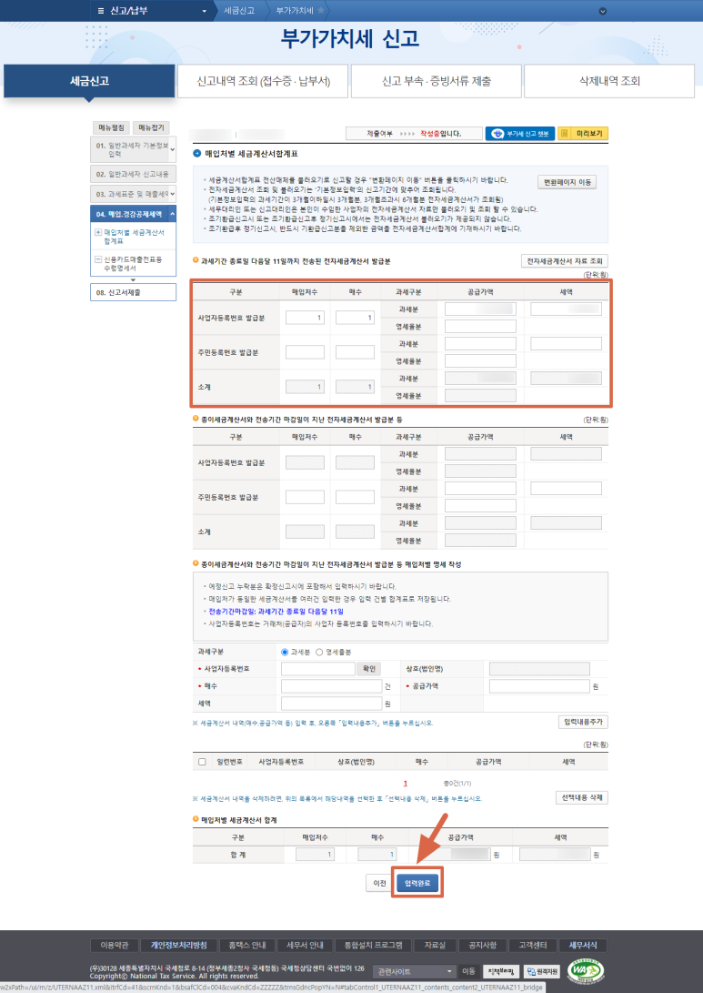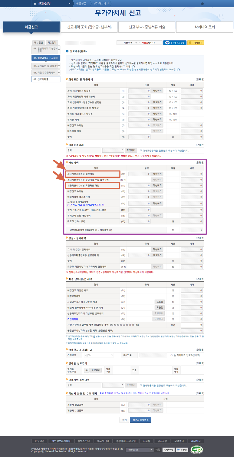 매입세액에서는 "세금계산서수취분 일반매입" 부분과 "세금계산서수취분 고정자산 매입" 부분을 입력하면 됩니다.