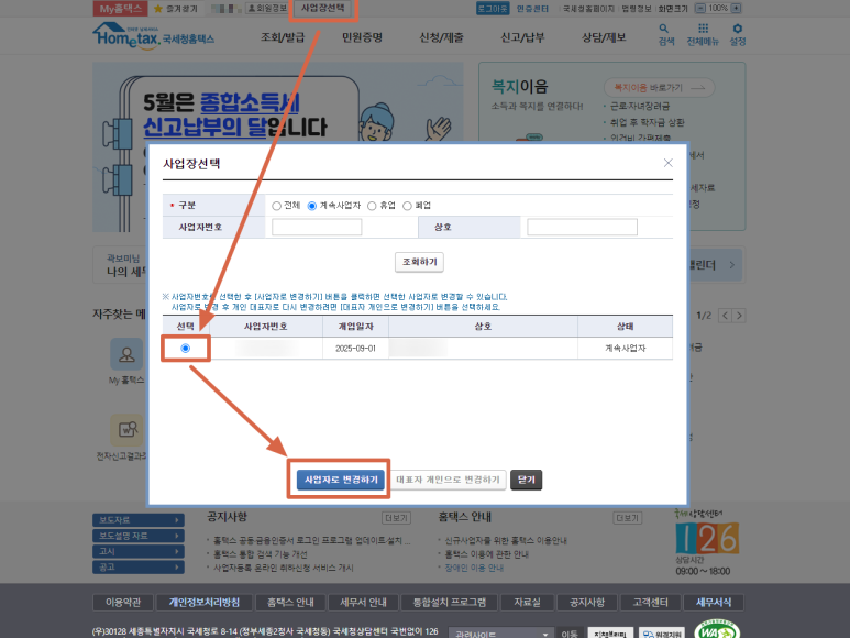 1) 홈택스 화면 상단의 "사업장선택" 버튼을 클릭합니다.