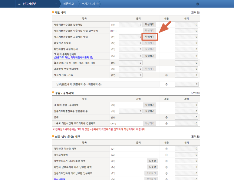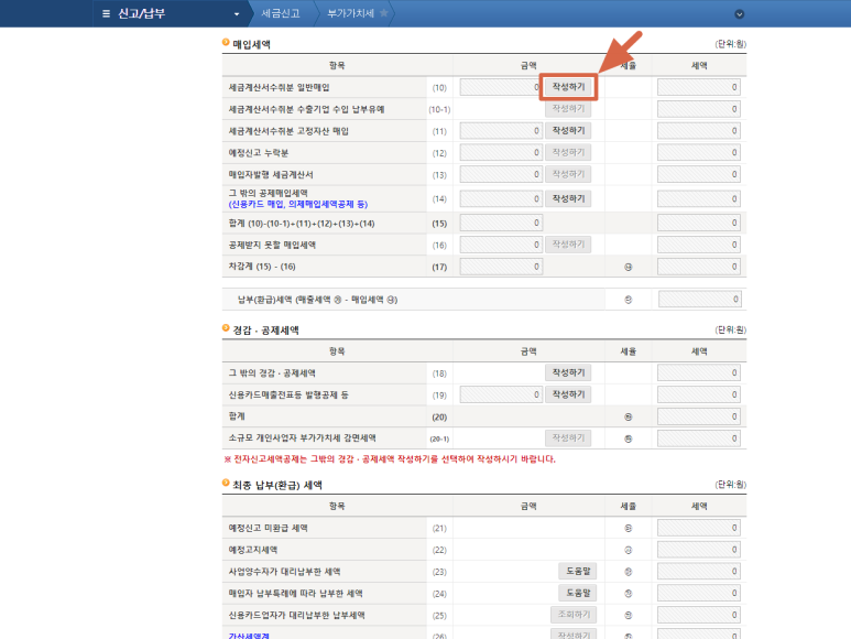 1) "세금계산서수취분 일반매입" 항목에서 "작성하기" 버튼 클릭