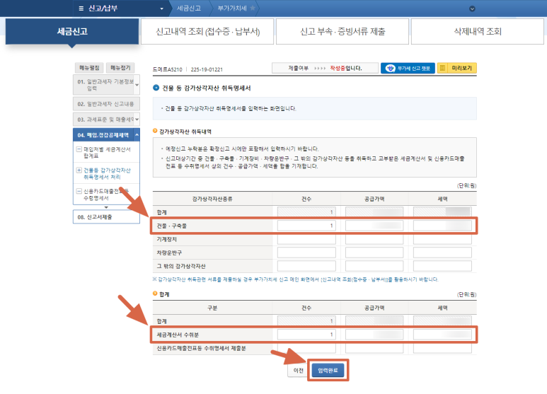 (저는 건물·구축물에 대한 항목만 입력했기 때문에 위에 작성한 표와 동일하게 입력했습니다.