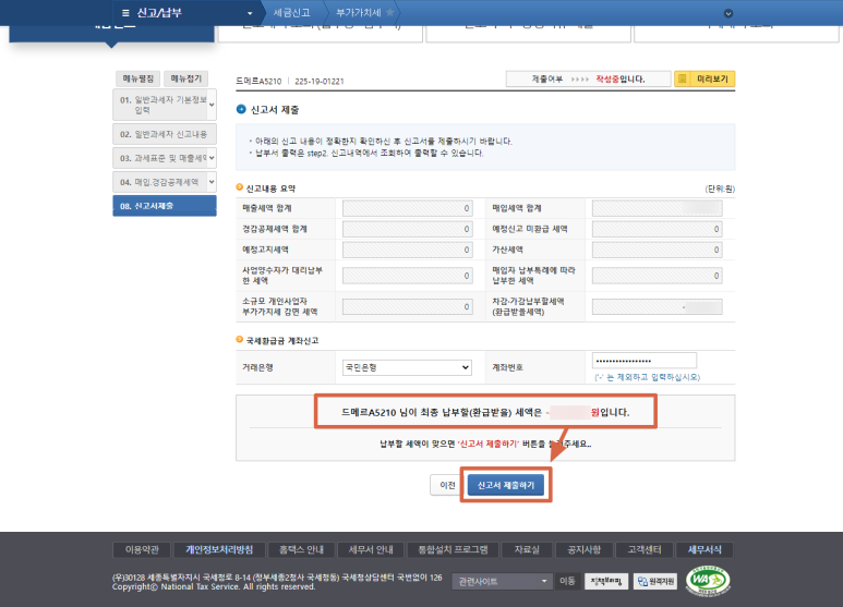 이제 거의 끝났습니다. 환급받을 세액이 맞는지 확인한 후 환급계좌를 입력하면 됩니다.