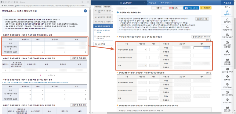 그러면 다음화면에서 전자세금계산서 자료를 조회한 후 매입한 매입한 금액을 입력할 수 있습니다.