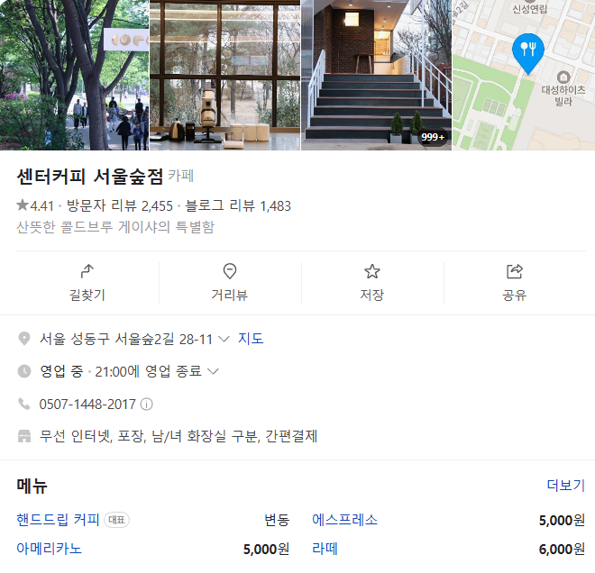 | 센터커피 | 통창 너머 서울숲 뷰, 스페셜티 커피 전문 | 필터 커피, 바스크 치즈케이크 |
