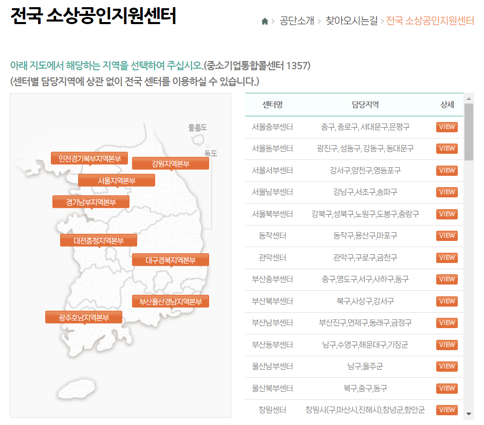 공단소개 〉 찾아오시는길 〉 전국 소상공인지원센터