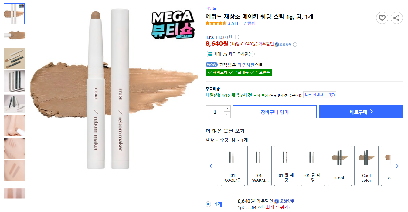 에뛰드 재창조 메이커 쉐딩 스틱은 1g 용량으로 웜 쉐딩과 쿨 쉐딩 두 가지 컬러로 출시되었습니다. 오늘 리뷰할 제품은 웜 쉐딩 컬러로, 채도가 빠진 자연스러운 웜 브라운 컬러입니다. 현재 가격은 11,200원(할인가 기준)에서 14,000원 사이로 판매되고 있어요.