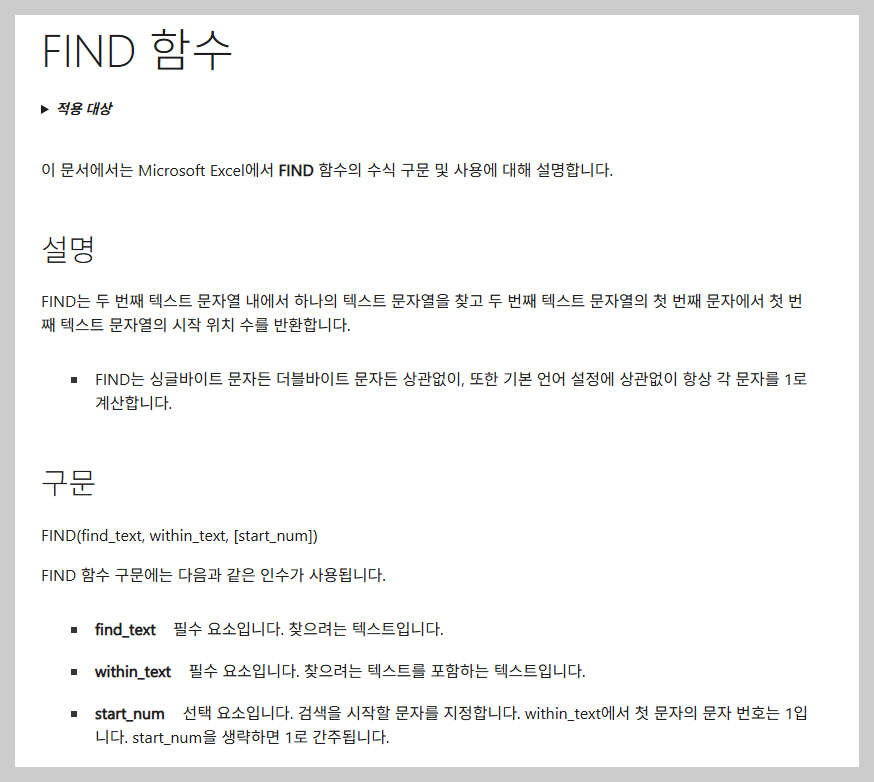 • FIND 함수는 텍스트 안에서 특정 문자의 '시작 위치'를 숫자로 알려주는 위치 탐색 함수입니다.