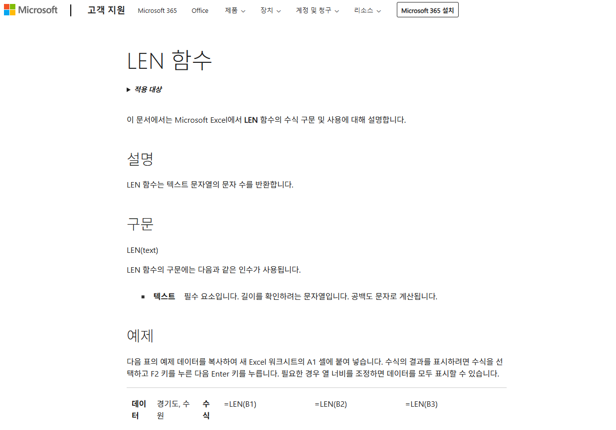 - text (필수): 길이를 계산하고 싶은 텍스트 또는 해당 텍스트가 들어있는 셀 주소를 지정합니다.