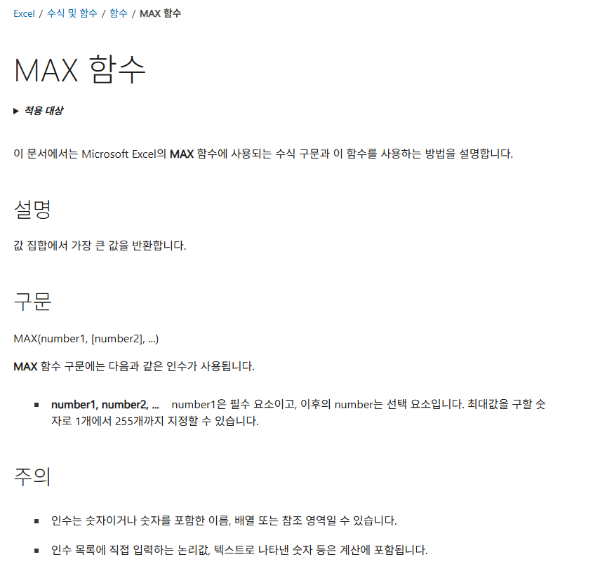- [number2], ... (선택): 추가적으로 최댓값을 찾을 숫자나 범위입니다. 최대 255개까지 지정할 수 있습니다[2]. 흩어져 있는 여러 범위를 동시에 비교할 때 유용합니다.