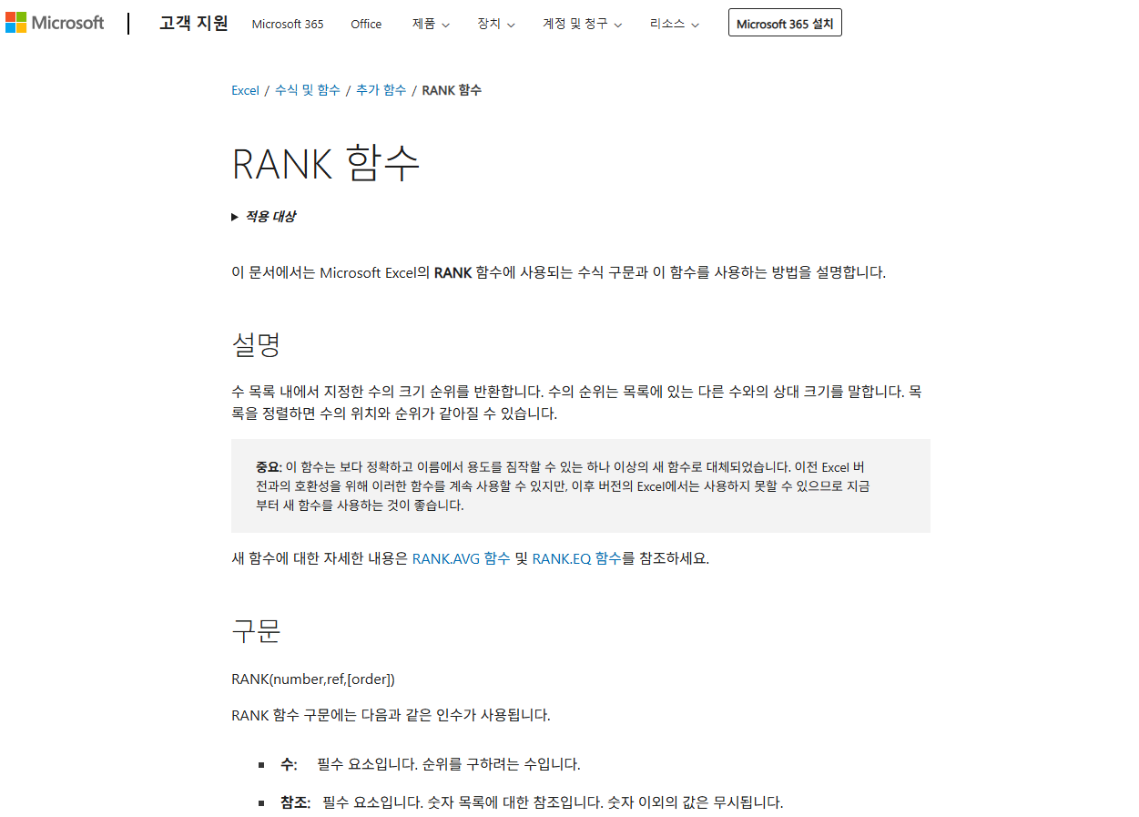 - ref (참조 범위): 순위를 비교할 전체 데이터 목록 범위입니다. (예: 전체 학생의 점수 범위) 이 범위는 수식을 복사해도 변하면 안 되므로, 반드시 F4 키를 눌러 '$A$1:$A$10'와 같은 절대 참조로 만들어야 합니다.