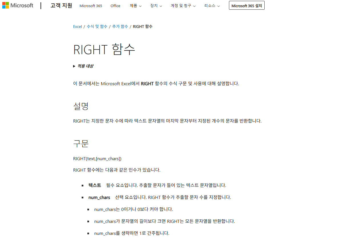 '어떤 텍스트에서(text), 오른쪽에서 몇 글자를 가져올지(num_chars)' 이 두 가지만 알면 RIGHT 함수 사용법은 완벽하게 마스터한 것입니다.