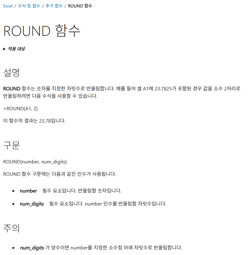 - 두 번째 인수(num_digits)로 소수점, 정수, 10단위, 100단위 등 원하는 모든 위치의 반올림이 가능합니다.
