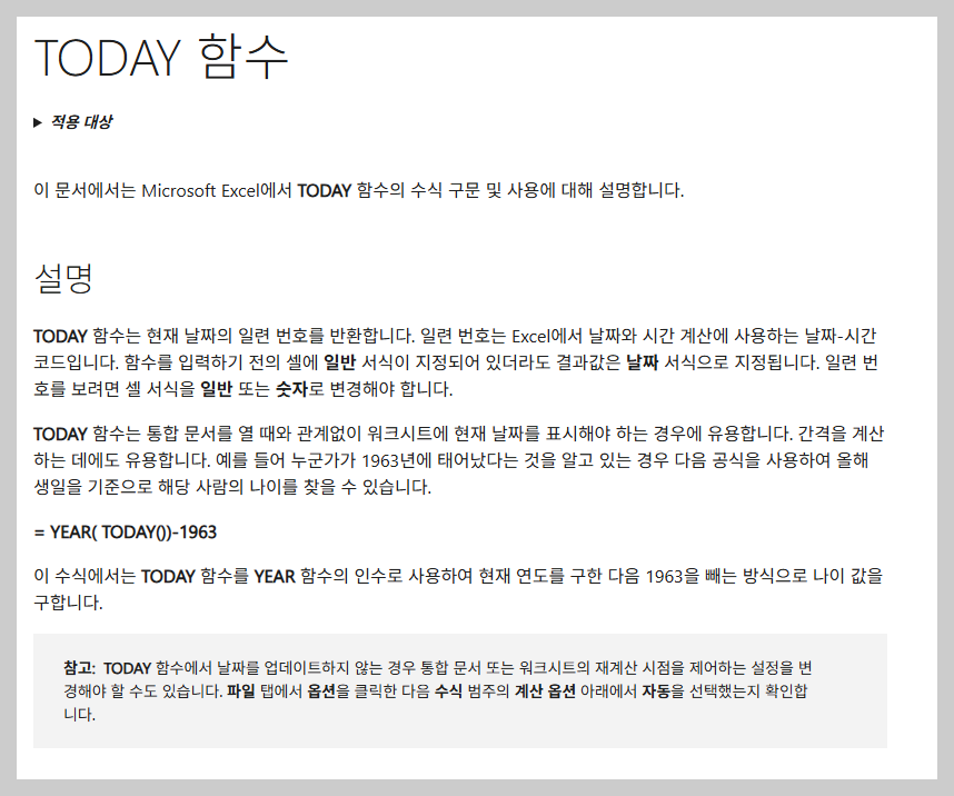 - TODAY 함수는 인수가 필요 없으며,