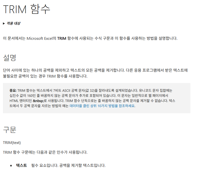 - 웹에서 복사한 특수 공백(CHAR 160)이나 제어 문자는 TRIM만으로 제거되지 않으므로, SUBSTITUTE, CLEAN 함수와 조합하여 사용해야 합니다.