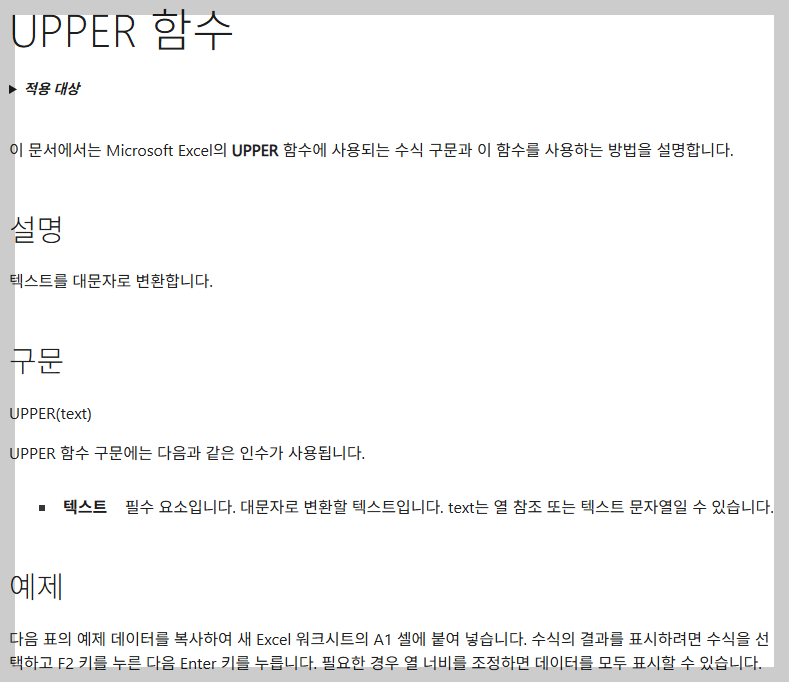 이 공식의 유일한 인수 'text'의 역할만 알면 UPPER 함수 사용법은 사실상 끝입니다.
