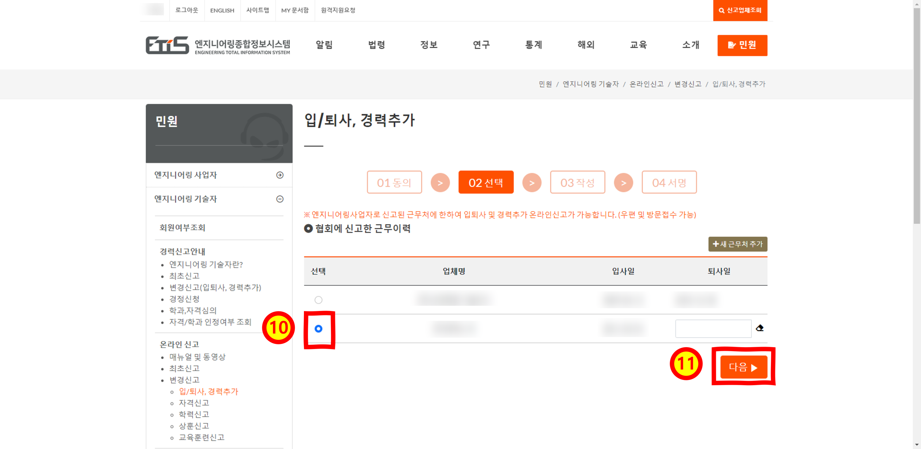 2. 상단 메뉴에서 "민원 → 엔지니어링 기술자"를 선택한다.